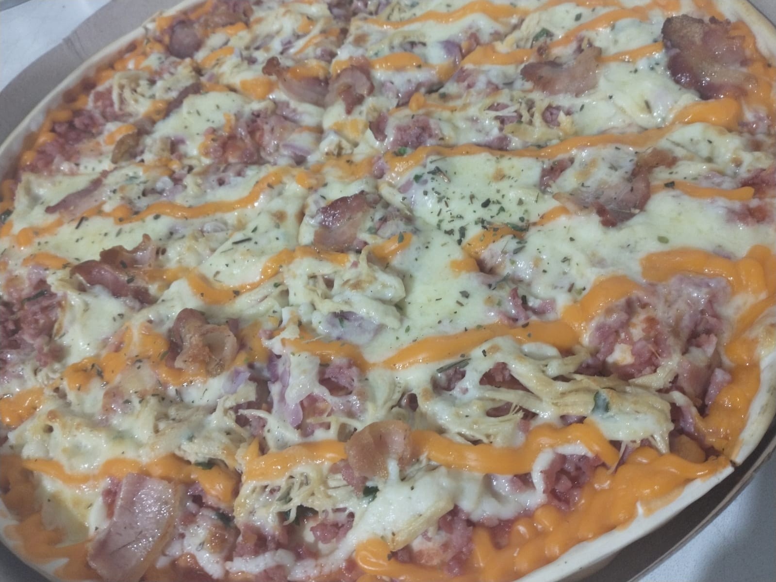 Calabresa Picada, Frango Desfiado, cebola, mussarela, bacon, Catupiry, Cheddar, PIZZA NÃO PODE SOFRER ALTERAÇOÊS NOS INGREDIENTES