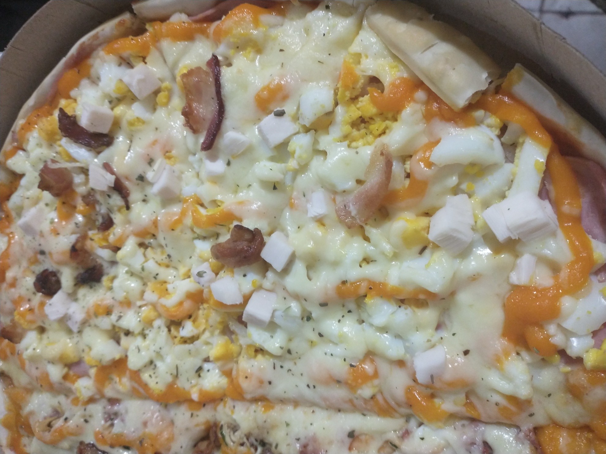 Presunto, CEBOLA, OVOS, PALMITO, Mussarela, Cheddar, BACON, Catupiry, ingr frango desfiado calabresa picada cebola cheddar catupiry mussarela e bacon pizza a moda do chefe
